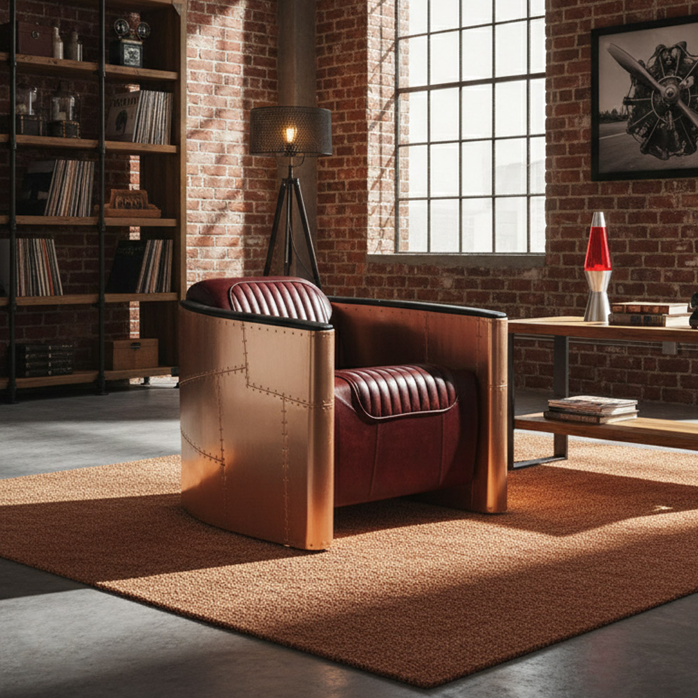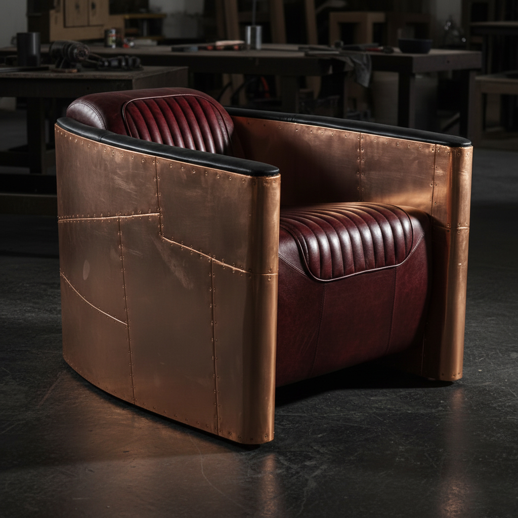 This Aviator Sofa Chair blends industrial craftsmanship with modern luxury. The curved metal body is finished in hand-polished copper panels, complete with aircraft-inspired rivets for an authentic vintage aviation aesthetic. The interior features premium leather upholstery with deep ribbed stitching, adding both comfort and sophistication.